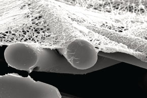左图是唐纳森Ultra-web滤材电子显微镜下放大1000倍后拍摄的照片,从截面照片上可以看到一层非常细的纤维网附着在粗大过滤显微层的表面,Ultra-web滤材可以捕捉大范围粒径的粉尘,从烟雾到粉尘,都有卓越的性能。