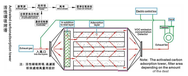 蜂窝状活性炭,具有很多微孔及很大的比表面积,依靠分子引力和毛细管作用,能使溶剂蒸汽和挥发性物质吸附于其表面,又根据不同物质的物理和化学性质,利用高温将其脱附出来;工作原理:含有机物的废气经风机的作用,经过活性炭吸附层,有机物质被活性炭特有的作用力截留在其内部,洁净气体排出;经过长时间吸附后,活性炭达到饱和状态时,停止吸附,此时有机物已被浓缩在活性炭内;此时应定期更换活性炭以确保处理效率稳定。