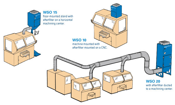 WSO主要优点有:1. WSO油雾过滤器可以满足各种设备的安装要求:可安装在机顶、地面或连接中央管道系统,如下图: